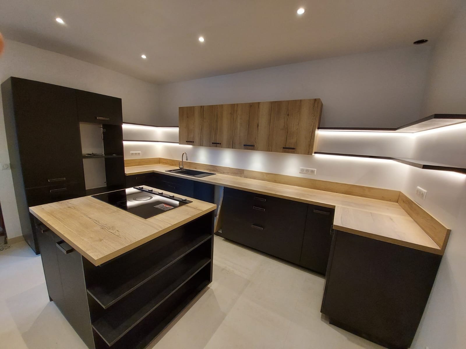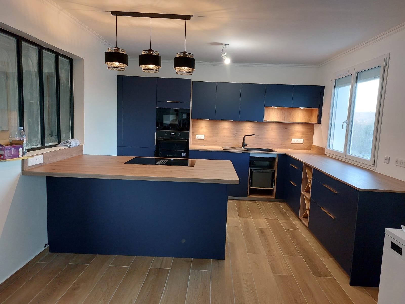 L’éclairage a fait l’objet d’un travail précis, avec des suspensions décoratives au-dessus de la table et un éclairage fonctionnel discret pour les zones de préparation.