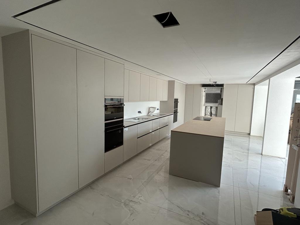 L’un des enjeux majeurs du projet résidait dans l’intégration parfaite de la cuisine dans l’espace existant, sans rupture visuelle avec la salle à manger. L’architecte a conçu une implantation linéaire, associée à une grande table centrale, pensée comme un trait d’union entre cuisine et espace repas.