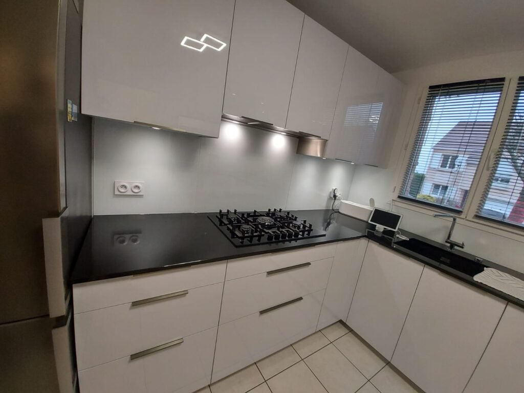 À la demande du client, les choix se sont portés sur des meubles aux façades claires et brillantes, afin de maximiser la luminosité naturelle, contrebalancés par un plan de travail foncé apportant contraste et élégance.